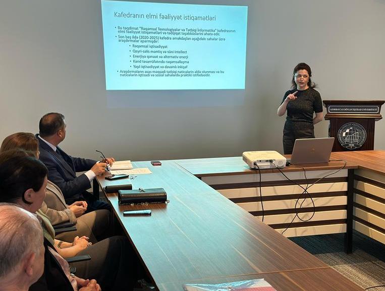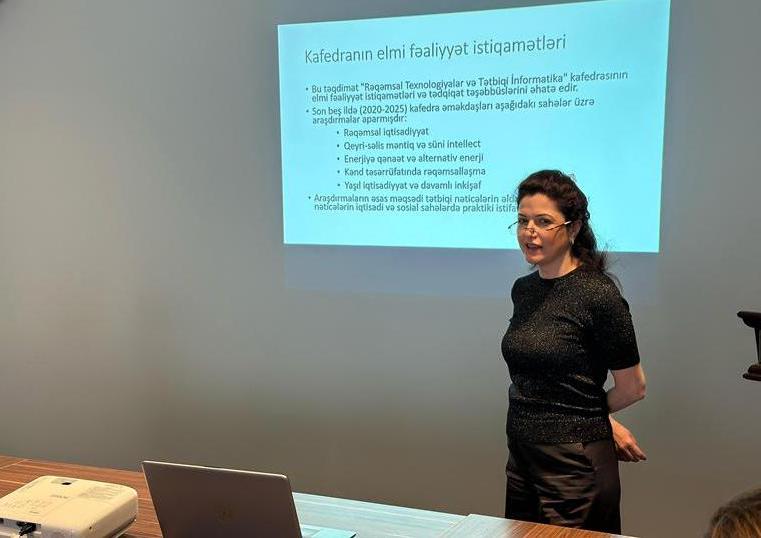 “Rəqəmsal Texnologiyalar və Tətbiqi İnformatika” kafedrası ilə “Rəqəmsal İqtisadiyyat” tədqiqat mərkəzinin birgə təşkilatçılığı ilə keçirilən tədbirdə fakültənin professor-müəllim heyətinin elmi-tədqiqat istiqamətləri təqdim edilib. İştirakçılar beynəlxalq və yerli elmi jurnallarda dərc olunmuş məqalələrin nəticələri, konfrans iştirakı və həyata keçirilən layihələrlə tanış olublar.