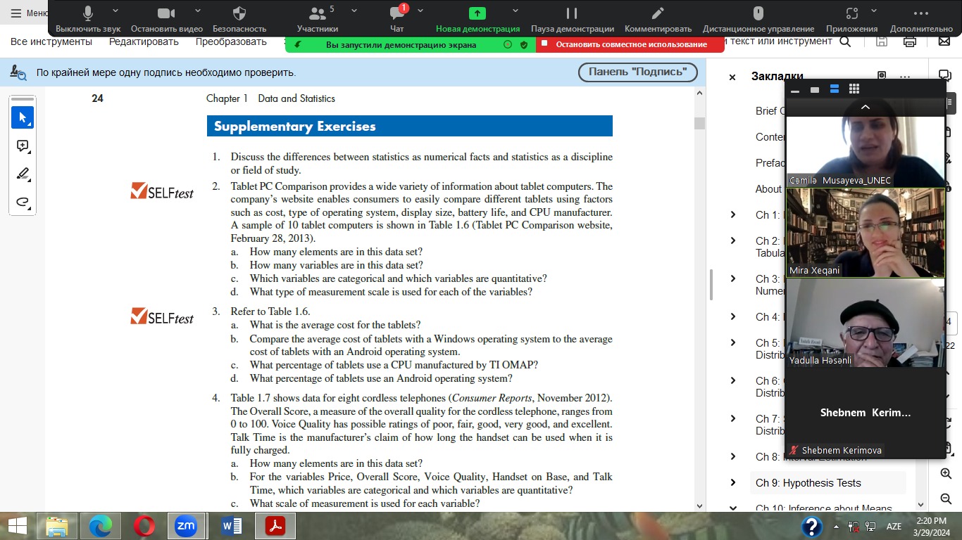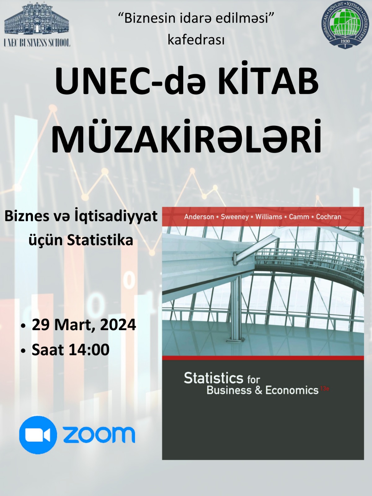 UNEC Biznes Məktəbində (MBA) Biznesin idarəedilməsi kafedrasının proqram rəhbəri Elnurə Şəfizadənin təqdimatında müəllifləri David R. Anderson, Dennis J. Sweeney, Thomas A. Williams, Jeffrey D. Camm, James J. Cochran olan “Statistics for Business & Economics” (13th edition) kitabının müzakirəsi keçirilib.