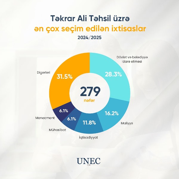 UNEC-də bu il qiyabi təhsil formasına təkrar ali təhsil üzrə qəbul olanların sayı Dövlət İmtahan Mərkəzinin xətti ilə qəbul olanların sayından yüksək olub. 19 ixtisas üzrə aparılan qəbulda tələbələrin 28 faizi “Dövlət və bələdiyyə idarəetməsi”, 16 faizi “Maliyyə”, 12 faizi “İqtisadiyyat, 6 faizi “Mühasibat”, 31,5 faiz isə digər ixtisasları seçib.