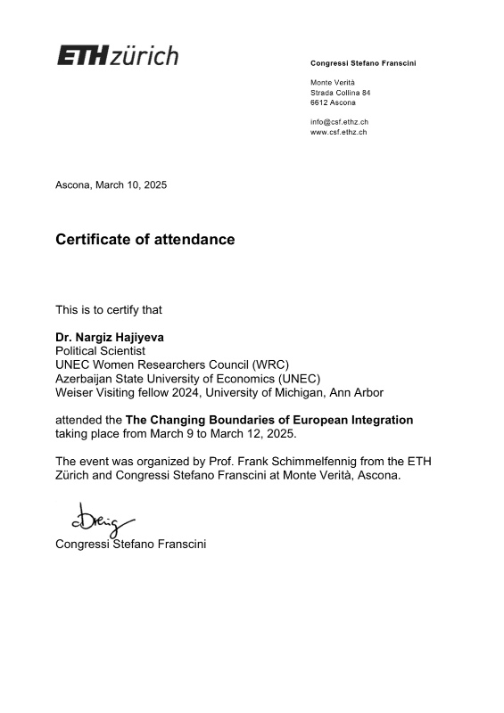 Azərbaycan Dövlət İqtisad Universitetinin (UNEC) Elmi fəaliyyətin təşkili şöbəsinin müdiri, UNEC Xanım Tədqiqatçılar Şurasının rəhbəri, siyasi alim Dr. Nərgiz Hacıyeva İsveçrə Konfederasiyasının nüfuzlu ali təhsil müəssisəsi “ETH Sürix” – Sürix Federal Texnologiya İnstitutunun professoru, Müqayisəli Siyasət beyin mərkəzinin direktoru, siyasi elmlər üzrə Frank Shimmenfennigin dəvətilə 09-12 mart tarixlərində İsveçrə konfederasiyasının Lokarno şəhərində keçirilən "The Changing Boundaries of European Integration" adlı beynəlxalq seminarda çıxış edib.