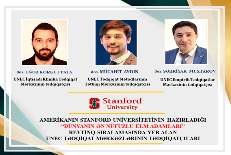 Dünya elm adamlarının fəaliyyətinin qiymətləndirilməsi məqsədilə hazırlanan siyahıda UNEC-in İqtisadi Klinika Tədqiqat Mərkəzinin tədqiqatçısı dos.Uğur Korkut Pata, Tədqiqat Metodlarının Tətbiqi Mərkəzinin tədqiqatçısı dos.Mücahit Aydın və Empirik Tədqiqatlar Mərkəzinin tədqiqatçısı dos. Şəhriyar Muxtarov da yer alıblar.