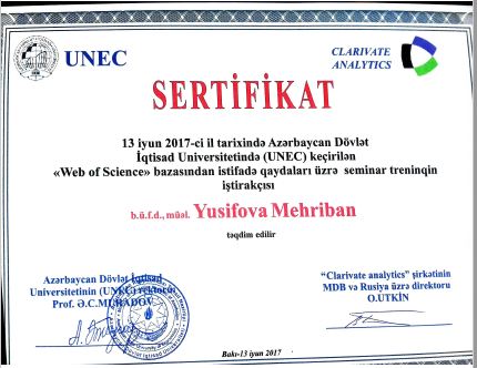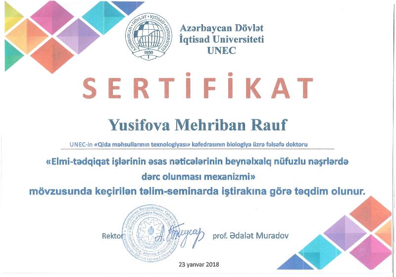 “Özünüqiymətləndirmə və keyfiyyətin yüksəldilməsi” şurası tərkibində fəaliyyət göstərən “Keyfiyyət elçiləri”–nin üzvüdür. 2018-ci ildə UNEC, Azərbaycan Əlil Təşkilatları İttifaqı, Müstəqil Həyat İnkişaf və Dəstək Mərkəzi və Dünya Əngəllilər Vaqfının birgə təşkilatçılığı ilə keçirdiyi “İnklüziv Təhsil” adlı təlimdə iştirak etmiş və sertifikatla təltif olunmuşdur.