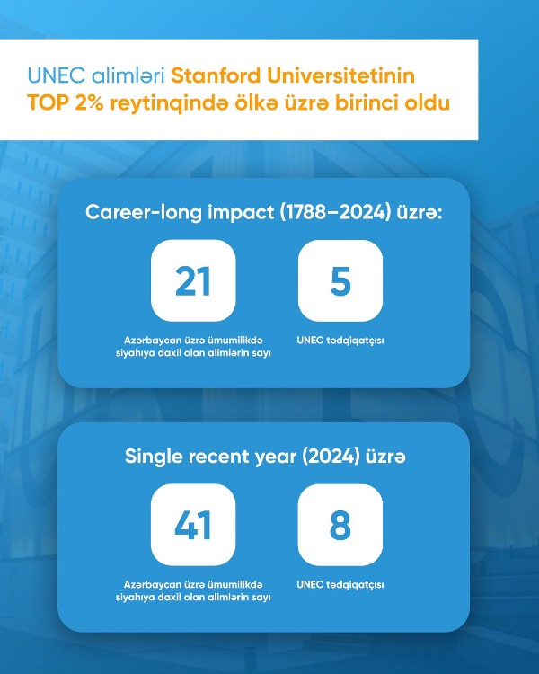 According to the career-long impact indicator, which evaluates scientists’ lifetime research output and citation performance up to 2024, 21 researchers from Azerbaijan were included in the list. Among them, 5 are faculty members of UNEC. This accounts for 24% of the total, placing UNEC first nationwide. Remarkably, in the previous year UNEC had no representatives in this category.
